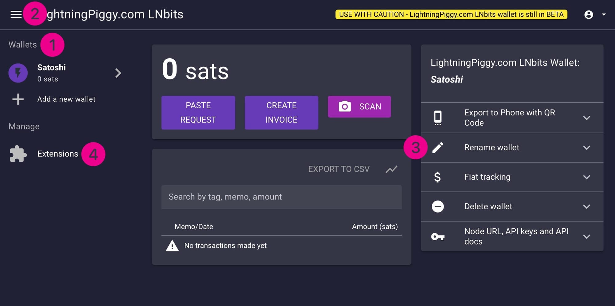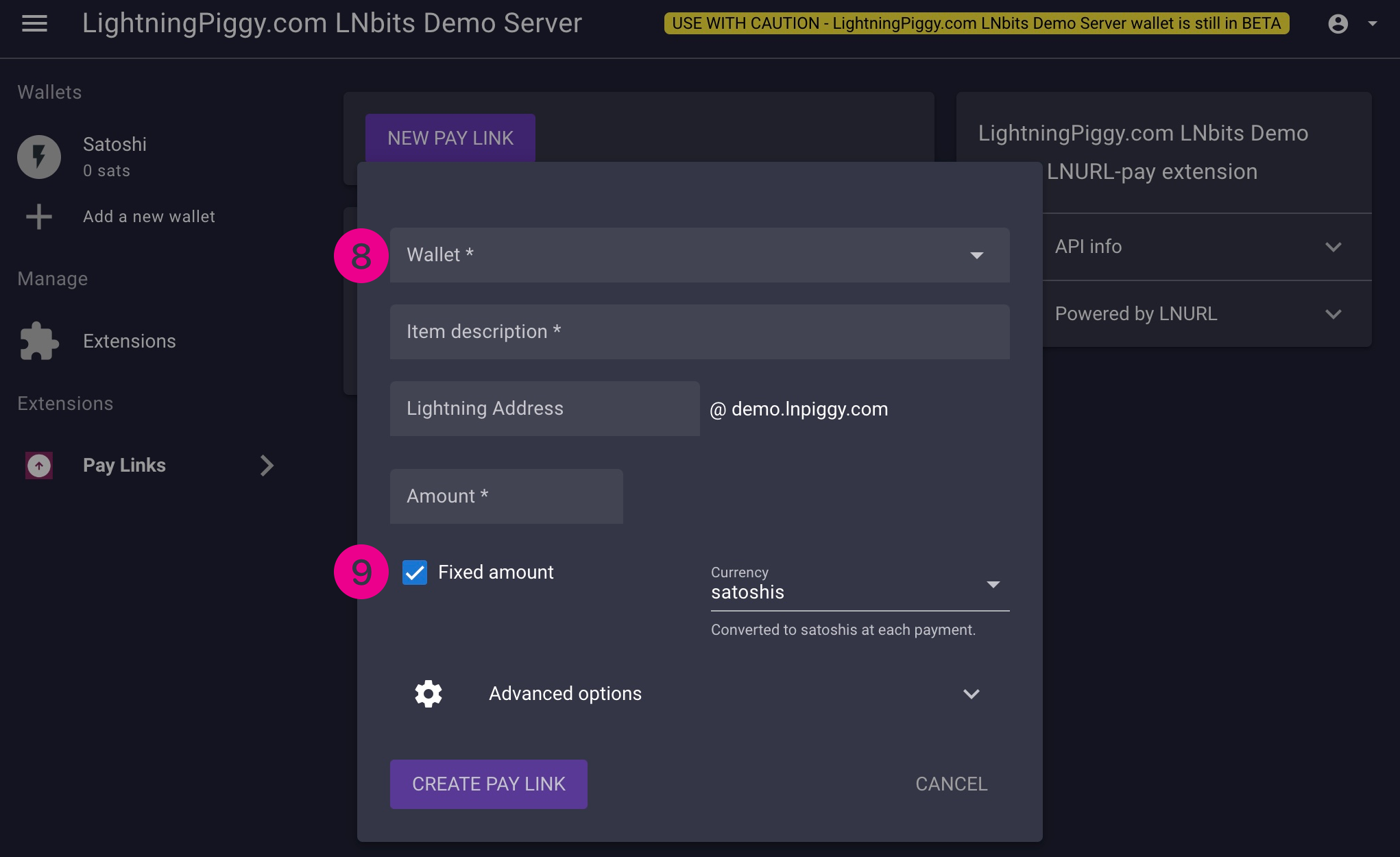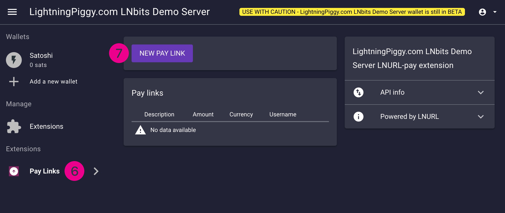 Now the Pay Links extension will appear under your wallets' list (6). Click it and select New Pay Link (7).