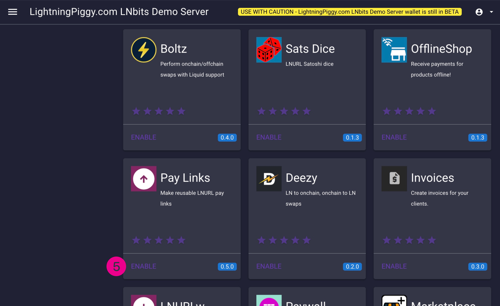 Under the Wallets header should be Extensions (4). Click this and find the Pay Links extension (5). Enable it by clicking Enable.