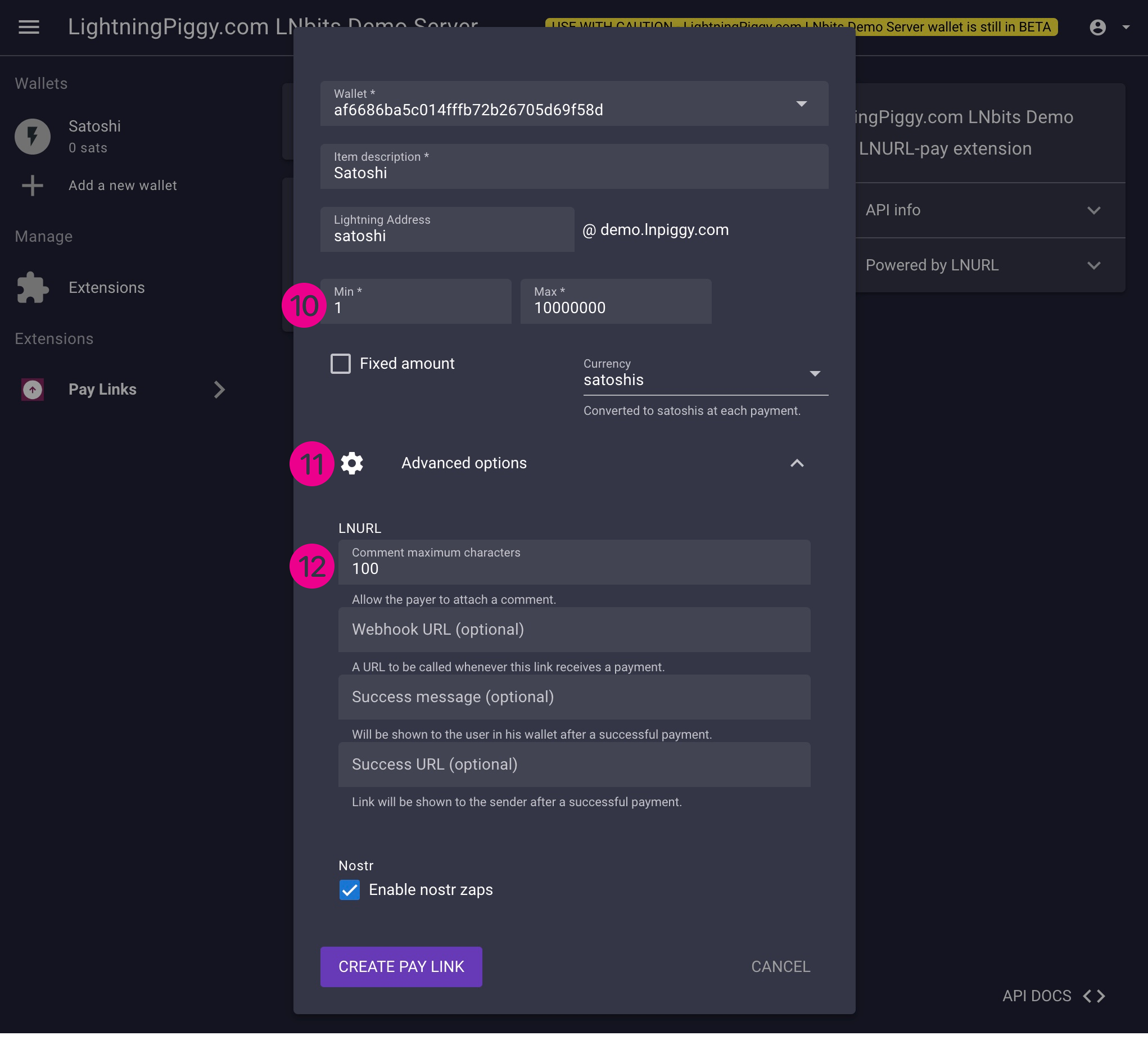We suggest using 1 Min and 10,000,000 Max (10). Click to expand the Advanced options area (11), and enter the maximum number of characters you wish to allow when someone leaves a message with a payment in the Comment maximum characters box (12). We recommend using 100. Enable nostr zaps if you wish and then click Create Pay Link to save the settings.