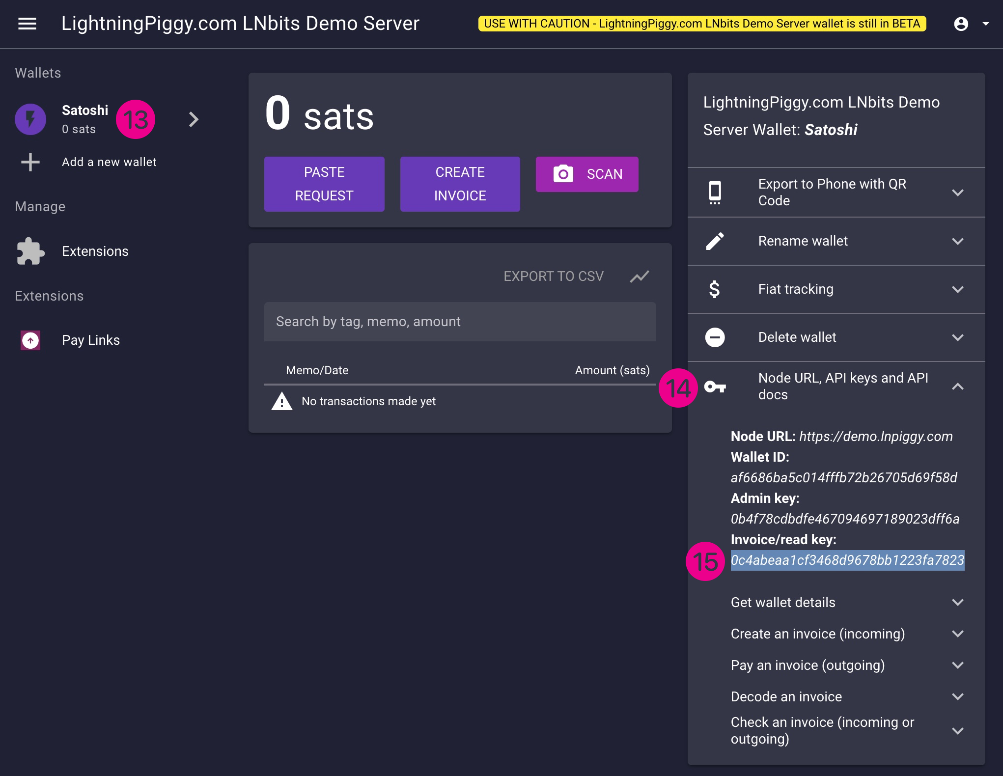 Now the piggy firmware is installed, click on your wallet name (13) and expand the API docs list on the righthand side of the page (14).